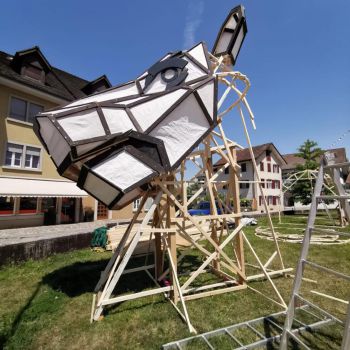 Foto des Aufbaus des Gerippe der Löwenskulptur