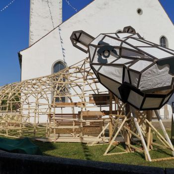 Luftansicht des Leueskulptur-Gerippes im Kirchenbezirk