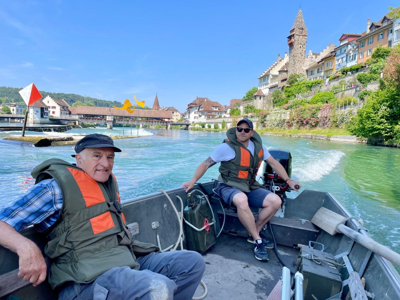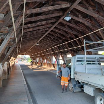 Foto eines Werkhof-Fahrzeugs auf der Holzbrücke Bremgarten