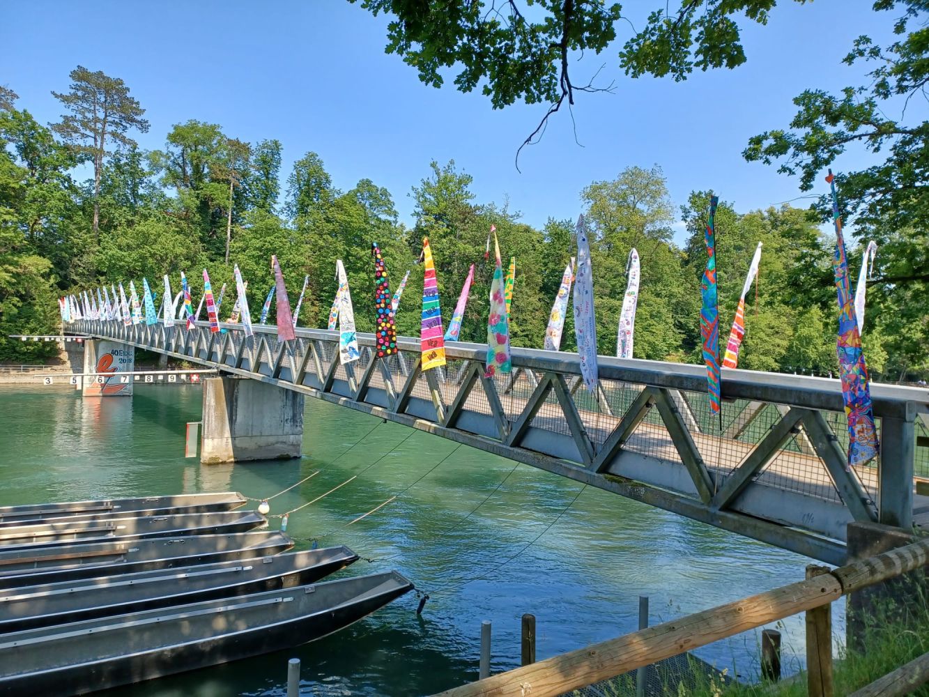 Der Isenlaufsteg mit den montierten Fahnen, die Fahnenbrücke!