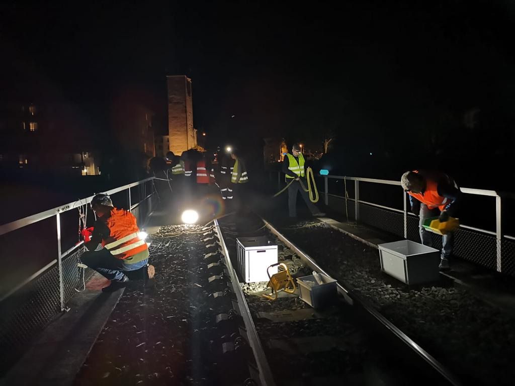 Der Fest-Namenszug als Leuchtschrift wird ab Betriebsschluss AVA auf der Eisenbahnbrücke montiert. Teil des Lichterweges.
