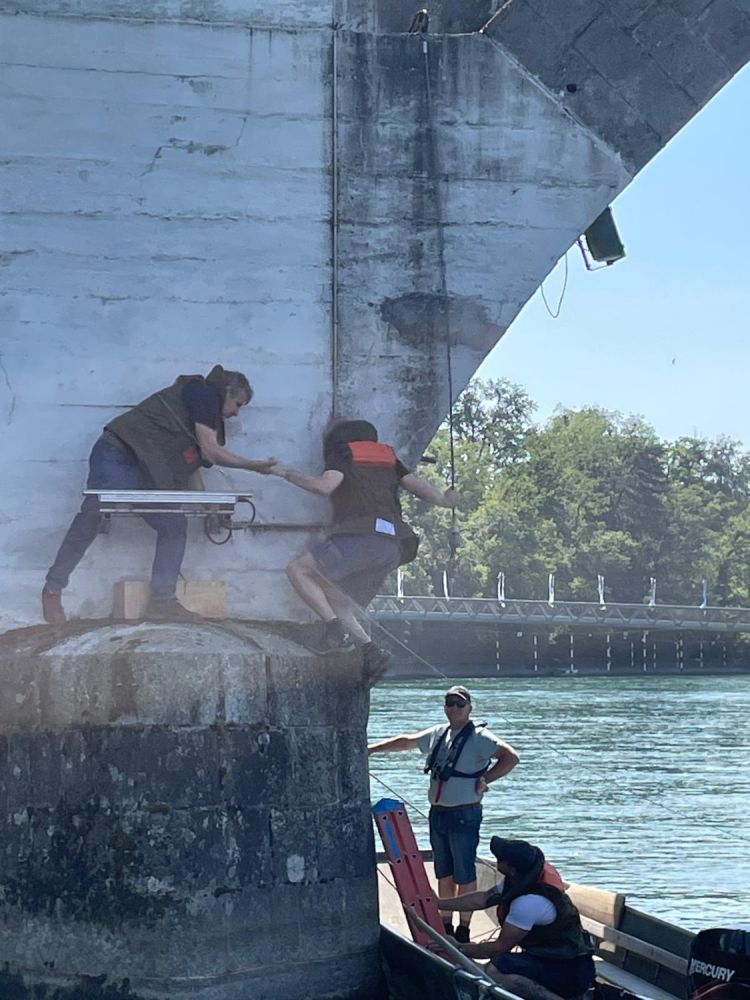 Installation der Bilder auf der Holzbrücke Bremgarten - es entsteht die Bilderbrücke.